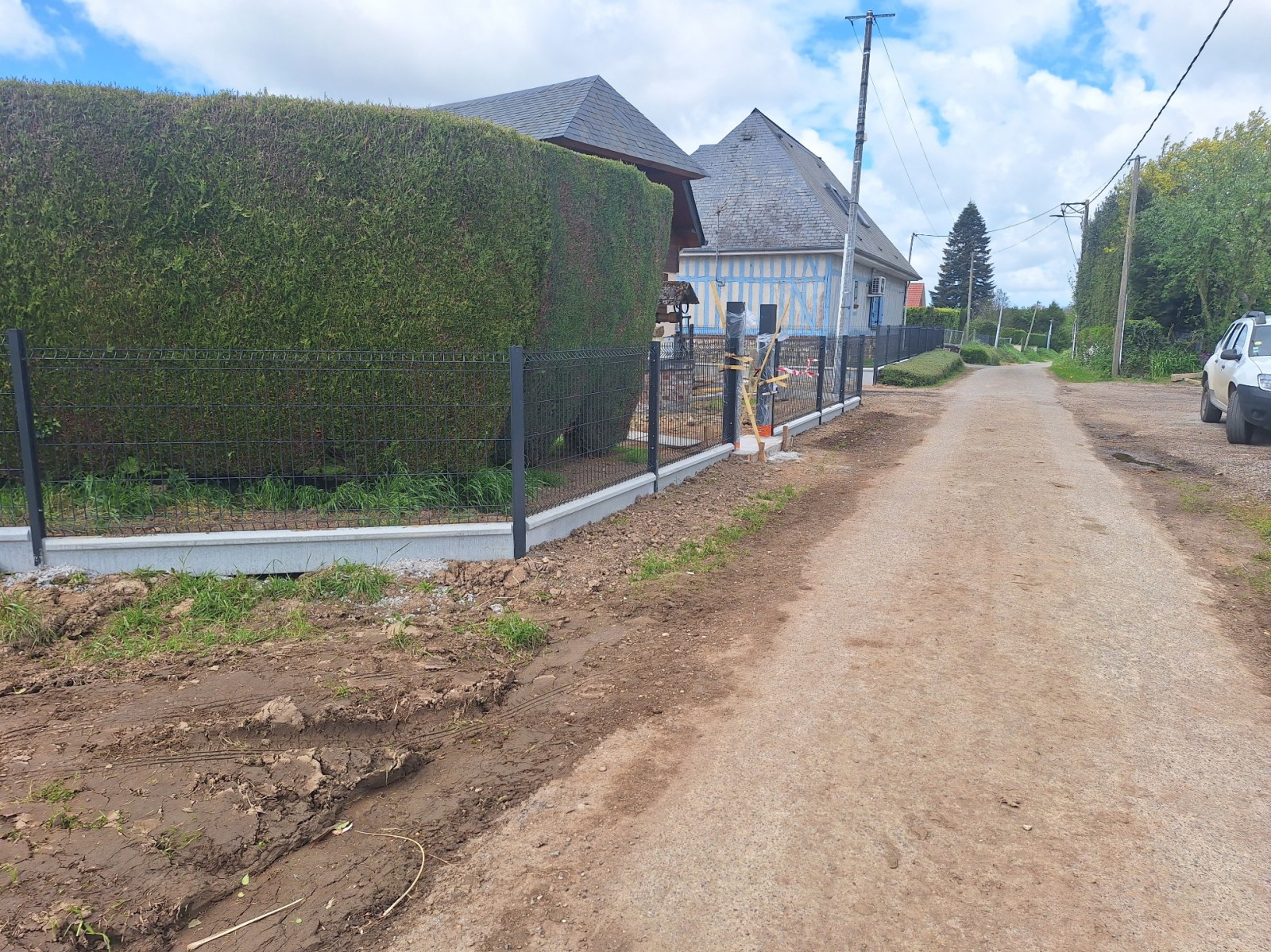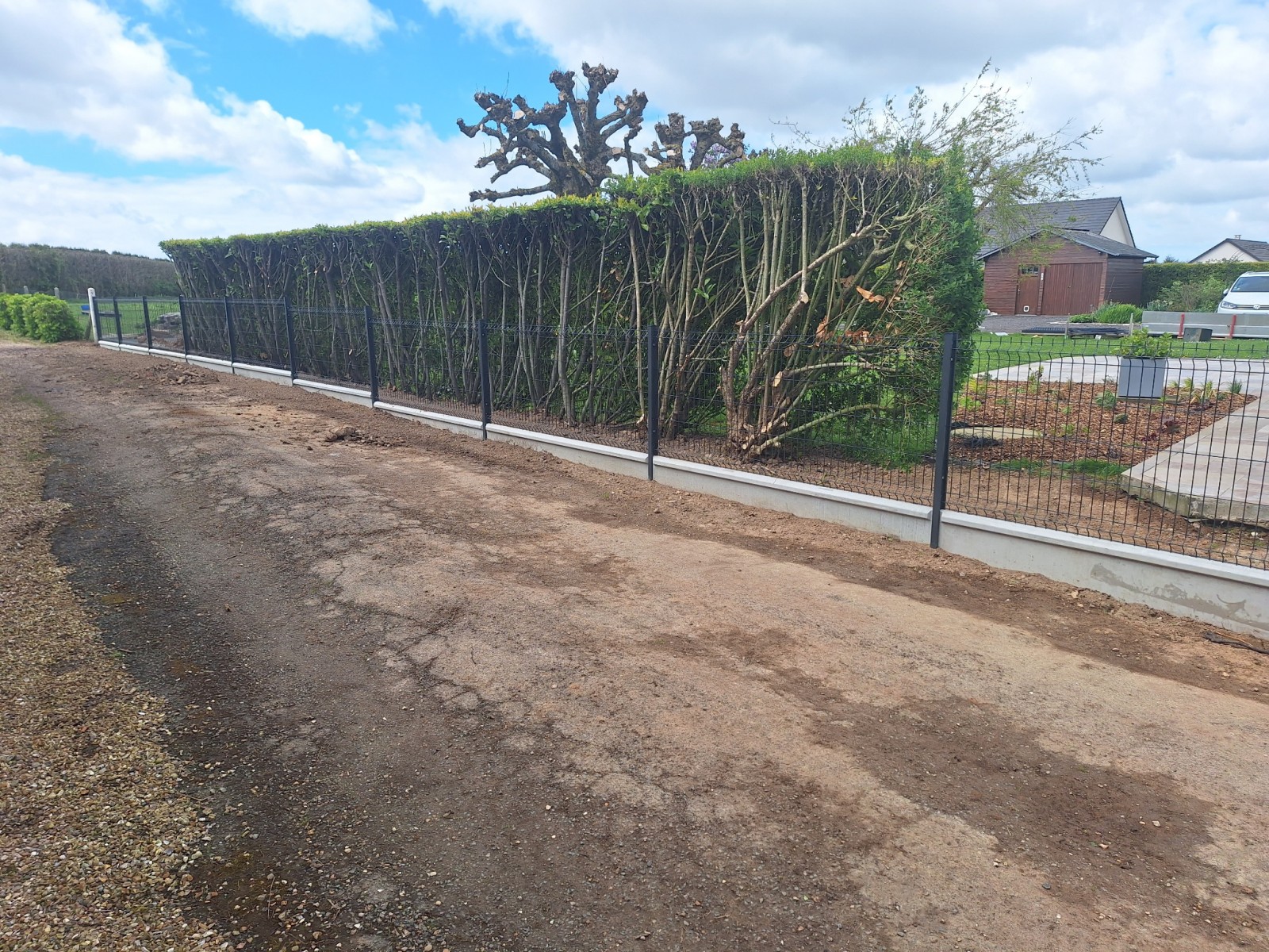 Nous avons donc procédé par la dépose des anciennes clôtures et la mise en place des nouvelles en panneaux rigide avec des dalles de soubassement en béton.